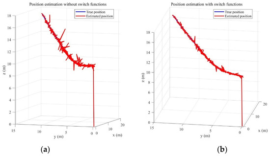 It can be seen from Figure 5a,b that, after adding the switching function, the accuracy was significantly improved when facing random large errors. After multiple tests, the accuracy was improved by about 50% in Figure 5c,d; of course, this was only limited to the introduction of random large errors. If there was always a peaceful and uniform error, the effect improvement was not significant.