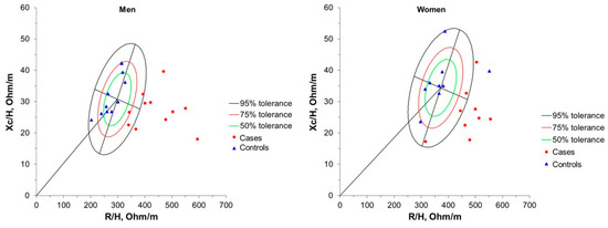 Bivariate vector positioning and tolerance ellipses of ALS patients (cases) and healthy subjects (controls). Impedance vectors plotted in the tolerance ellipses of 50%, 75%, and 95%, according to the reference population. R/H, Resistance/Height. Xc/H, Reactance/Height.
