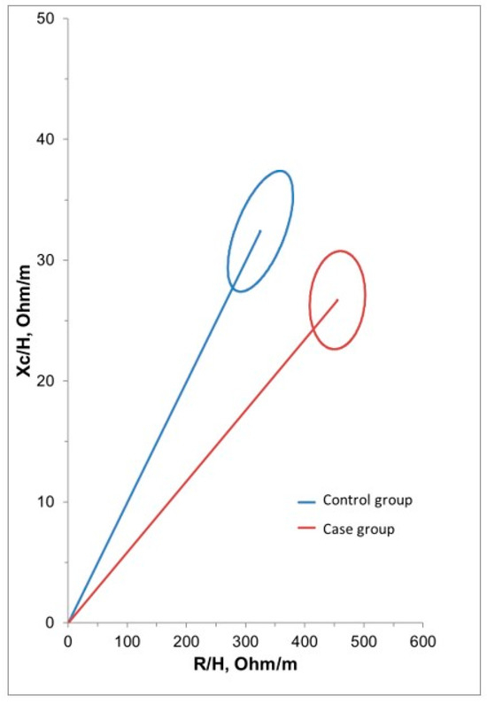 Protocols and considerations for the assessment of the PhA and BIVA are described in the literature [23,36,37,38]. Briefly, R and Xc data were subsequently used to determine the PhA and BIVA. The PhA was calculated using the following formula: PhA = tangent arc (Xc/R)*180/π [37]. The BIVA results were based on the analysis of normalized R and Xc values for the patients’ height (H) measurements (R/H and Xc/H in Ω/m), as a single vector measured in an individual at a single time [39].