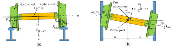 Due to the conicity of wheel tread, the normal forces of both wheels are not strictly in the direction of gravity, so they have lateral components generally named gravitational restoring forces. As shown in Figure 1a,b and marked as and , these two forces will work in the lateral and yaw movement, so they should be considered in the IRW model.