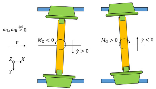 Generally, in the force analysis process of conventional wheelsets for lateral dynamics research, only creep, spring, damping, and inertia forces are considered. Under the considerable influence of longitudinal creep forces, the effects of gravitational restoring forces are often simplified or omitted. However, it is widely regarded that the effects of longitudinal creep forces on the IRW’s lateral dynamics are negligible. Then, some forces simplified or omitted before may regain dominance in the IRW’s motion. In this study, the influences of gravitational restoring forces and gyroscopic moment are considered. They are introduced in Section 2.2 and Section 2.3, respectively.