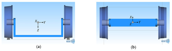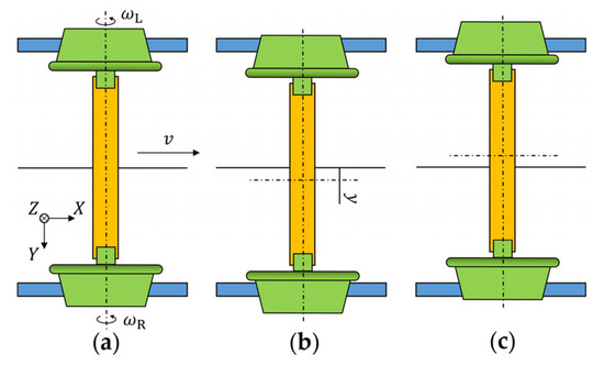 As shown in Figure 1, a concept model of the IRW is introduced to deduce mathematical models and study its dynamic characteristics. For lateral dynamics analysis, an IRW can be simplified into three main parts: a left wheel, a right wheel, and a carrier of the two wheels. Under constraints of the bearings between the carrier and wheels, only relative rotation is allowed. Under constraints of contact patches between rail and wheels, the contact position of each wheel should obey the geometric profile in three dimensions. Additionally, under the constraint of the rail gauge, two sides of the wheel–rail contact patches have a positional relationship between each other. Then, the IRW’s degrees of freedom (DOF) can be obtained as