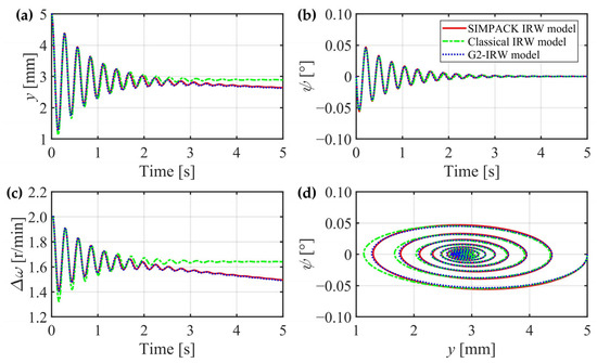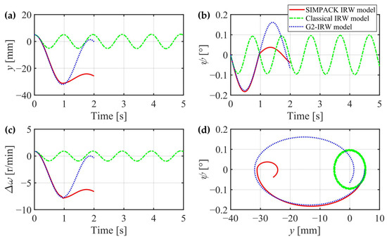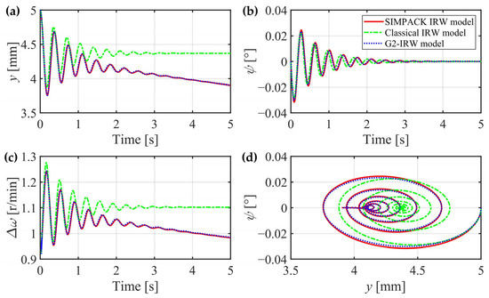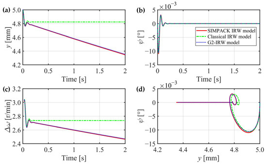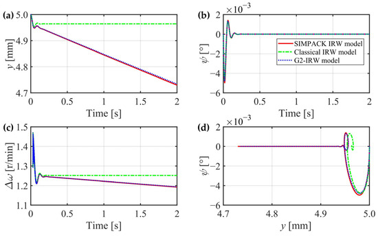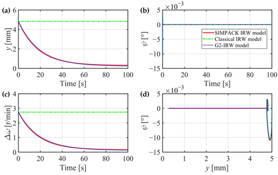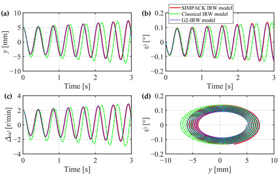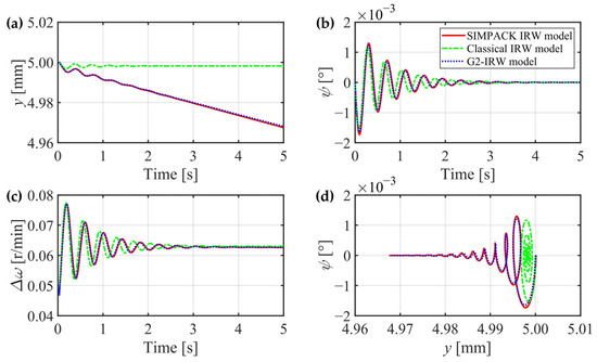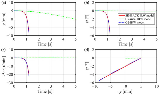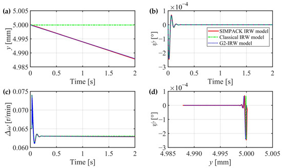 In this section, the creep forces of the two wheels are separately calculated for higher accuracy, the gravitational restoring forces are considered, and the gyroscopic effect can be theoretically proved through mechanics analysis. However, whether these three factors can significantly affect the IRW’s dynamic characteristics still needs to be verified. In the next section, a classical IRW model is introduced without consideration of the three factors, and an IRW model built in the general multibody system simulation software SIMPACK 2018 is regarded as a criterion. The G2-IRW model deduced in Section 2.4 will be compared with them in detail.