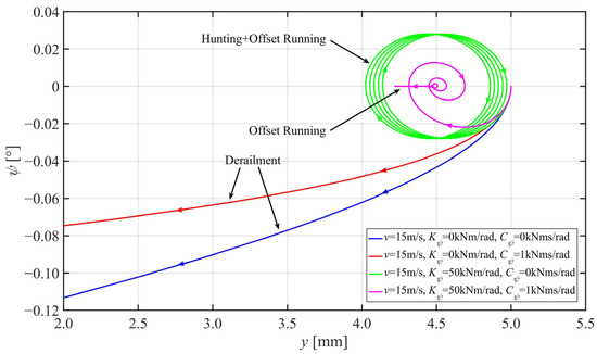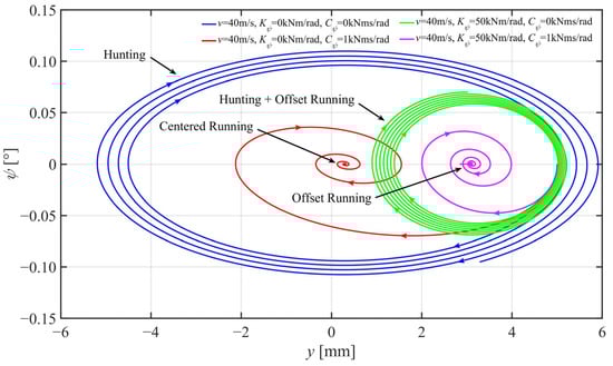 Although the initial states were not forced to a fixed point during the experimental verification, the three types of the IRW’s dynamic characteristics, derailment, hunting, and offset running, are still observable and recognizable. During about half a year of conducting simulations and experiments, we have not encountered a situation where initial state selections can change the type of the dynamic characteristics. For example, the dynamic characteristic is always derailment if the IRW runs at low speeds and without yaw suspensions, no matter where the initial states are. In contrast, the dynamic characteristic is always offset running if the IRW runs at low speeds but with yaw suspensions, no matter where the initial states are. We found that for an already designed IRW system, only velocity, yaw stiffness, and yaw damping could significantly influence the type of the dynamic characteristics in one specific experiment. We speculate these three parameters prominently affect the system poles of the IRW’s root locus diagrams and are now working on theoretical proof.