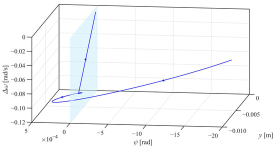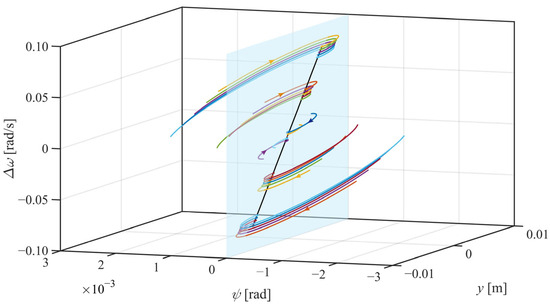 In view of the simulation results in Figure 20 and the analysis in Section 4.2, if proper yaw suspensions are deployed, no matter where the initial states are, the IRW will experience two stages: a damped dynamic stage and a steady convergent stage. Firstly, they all converge to the straight line described by Equation (47), as shown in Figure 20. Then, they will move slowly along this straight line to the origin (). This is a reflection of the simulation results on the explanation and speculation above.