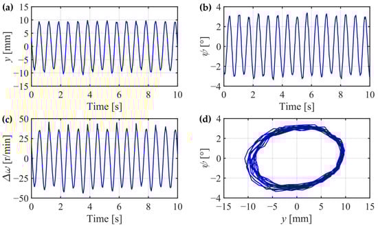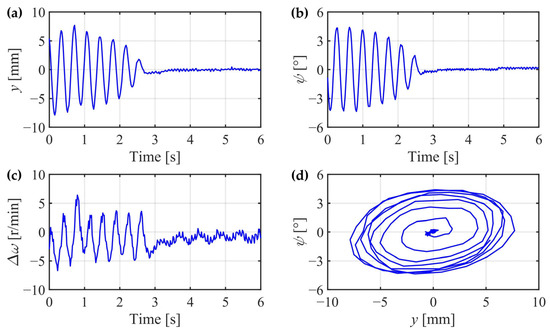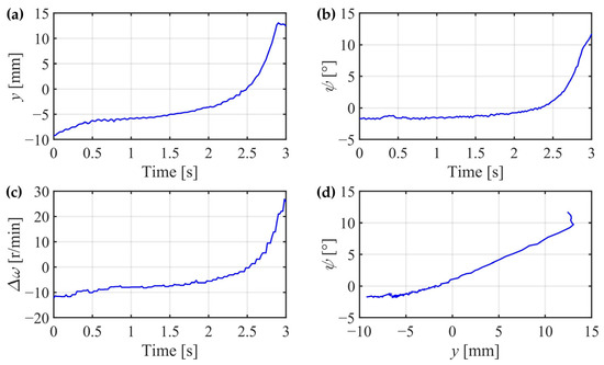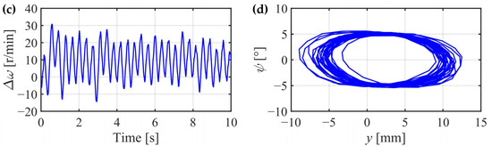 If the yaw suspensions are all disconnected, and the IRW is accelerated to the wheel rotational speed of 895 r/min, a unique phenomenon similar to the hunting motion on the SW will also appear on the IRW, as shown in Figure 27. The experimental results show that the lateral displacement and yaw angle oscillate alternately. However, the differential wheel rotational speed also varies with , which differs from the SW. This phenomenon demonstrates that although the IRW rides without any yaw suspension, if the rotational speeds of the wheels are high enough, the derailment tendency will be conquered, and the self-guidance ability will be regained. The experimental results are in accordance with the simulation results in Section 3 and Section 4.1, and the phenomenon can be interpreted by the gyroscopic effects discussed in Section 2.3.