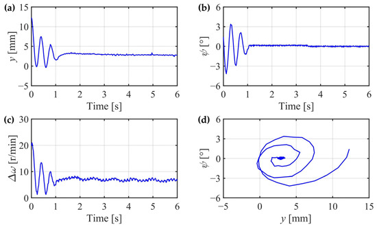 Equation (47) shows a kinematic relation between differential rotational speed and lateral displacement . The coefficient is relevant to the equivalent wheel–rail tread conicity , the velocity of the IRW , and the nominal wheel radius . This kinematic relation demonstrates the intrinsic law for the offset running phenomenon on the IRW. Due to the freedom of the two wheels in the rotation direction around their axles, the differential rotational speed of the IRW does not have to be zero because the lateral displacement can compensate for it. When the steady state of the IRW changes, for example, the differential rotational speed changes from to , and the lateral displacement also changes from to along the kinematic relation described by Equation (47). Then, the IRW will adjust to a new balanced steady state . Therefore, the freedom of the differential rotational speed on the IRW leads to the freedom of the lateral displacement. That is why the IRW can be balanced at any state pair as long as their kinematic relation can satisfy Equation (47). This phenomenon will be demonstrated later in the simulations and experiments.