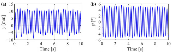 Equation (46) demonstrates that the lateral displacement will exponentially converge to zero under the gravitational effects after time , which means that the convergence rate decreases with the convergence of . Thus, when is quite close to zero, the convergence rate will be quite low as well. Additionally, the denominator of the decay coefficient contains the lateral Kalker’s creep coefficient , of which the magnitude is large, resulting in a small decay coefficient. Additionally, a small wheel tread conicity is sometimes adopted. Therefore, although the lateral displacement can converge to zero eventually, the convergence rate is very small, which makes almost steady in a short duration of time. That is why the running trailer of the IRW is always offset to the center of the railway track, and only if the time duration is long enough, will the lateral displacement converge to zero under the gravitational effects eventually.