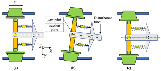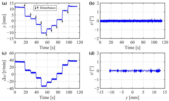 When the IRW enters the steady convergent process, the dynamic oscillations are suppressed by the yaw suspensions, and the IRW only presents offset running, as described by Equations (45)–(47) in Section 2.5. Here, we applied some instantaneous lateral disturbances in sequence on the traction plate. The process of each disturbance input is shown in Figure 30.