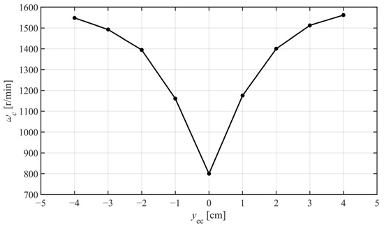 Additionally, the effect of the gravity center’s lateral position on the critical speed is nonlinear. We speculated that it is related to the interaction between the variations in the inertia moments and the variations in Kalker’s creep coefficients. With the extra loads’ gravity center becoming far from the axis of symmetry in the lateral direction, the inertia moments to the geometric rotation center grow larger, which makes the scaled IRW less prone to oscillate. However, the difference between the vertical loads on the two wheels also becomes larger, which decreases the average Kalker’s creep coefficients and makes the scaled IRW more likely to oscillate. The farther the gravity center’s lateral position away from the axis of symmetry, the more significantly the dynamics are affected by the variation in Kalker’s creep coefficients. These two factors cause the nonlinear variations in with . Nonetheless, more detailed experiments and theoretical analysis are needed for solid confirmation.