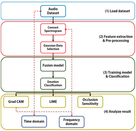 In modern society, speech is used in various fields, including human–computer interaction, emotion analysis, and voice-based services. Speech is a representative way for users to express information, emotions, and thoughts. Therefore, it has become important to accurately receive and analyze speech data acquired from computers, smartphones, smartwatches [1], and smart homes to understand the emotions and thoughts of users. The information obtained from speech data is used to improve the quality of products and services. It is analyzed in various fields, such as mental state recognition, emotion classification, emotional analysis, the Internet of Things, and speech recognition systems [2]. It is also used for decision-making and health-status monitoring by understanding the emotional states of individuals or groups [3]. Unnecessary elements, such as environmental noise, breakage, and errors in speech classification add uncertainty to the inferred results. This leads to distrust in the model in terms of the correctness of the area focused on and the performed classification. Applying appropriate preprocessing can remove these unnecessary elements while increasing the quality of voice data [4].