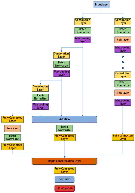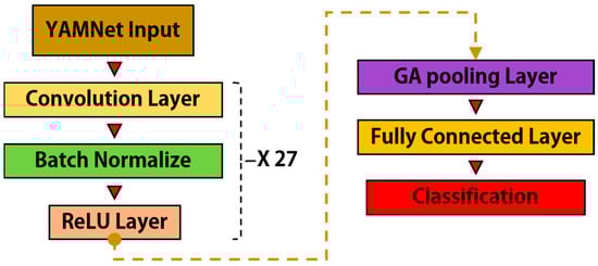 Similar to VGGish, YAMNet, as shown in Figure 5, is an audio classification model developed by Google. It is a transfer learning model that learns from a large-scale dataset to perform 512 different speech recognition tasks, including animal sounds, cars, music, nature, and human conversations. This model is based on a CNN and consists of a convolution layer that can extract spatial patterns and features of multiple images. It also contains a pooling layer, which increases computational efficiency by reducing the spatial dimensions, as well as an activation function layer. Using a global pooling layer before the classification layer, the model focuses on the channel characteristics of the extracted feature map rather than the time–frequency positional characteristics of the feature map input from the previous layer. It is designed to identify the overall features of the input spectrogram image and does not rely on the positional features. Figure 6 shows the classification process of combining the feature maps obtained from each transfer learning model. Here, feature maps in VGGish were obtained by each pooling layer except for the first pooling layer.
