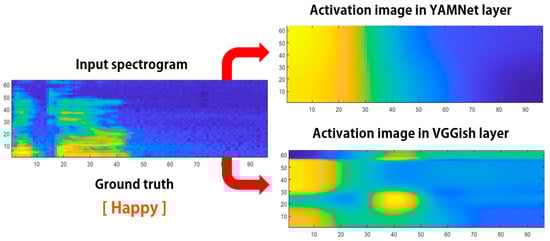 This study selected a late-fusion method to input the same data into YAMNet and VGGish, learn in parallel, and appropriately combine the obtained information to improve the classification results. Figure 7 shows the area activated using Grad CAM in the layer before classification, when the same spectrogram image is input to each model. Owing to the structural differences between the models, VGGish achieves a high location resolution by extracting locational features in the time–frequency domain of the image. Conversely, YAMNet is designed to identify overall features of an image and does not rely on locational features to analyze information. Consequently, there is a difference in analyzing information.