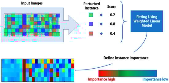 LIME is an explainable technique that determines how small areas, such as pixels of the input data, affect model classification [20]. As shown in Figure 11, the above method transforms a specific area of the input image by adding noise, inputs the transformed areas into the model, and measures the prediction results of the model. A vector is created from the measured feature values for each pixel or specific area, and training is performed using a simple model, such as linear regression, based on the prediction results of the images corresponding to the feature vector.