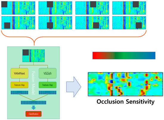 Figure 12 shows how occlusion sensitivity can be achieved by blocking a specific area of the image inputted into the model. The impacted areas were determined by checking the results based on occlusion sensitivity. Continuously altering the position of the blocked area visually illustrates the extent of influence of each position on the model predictions. The above method examines the influence of the area by repeatedly covering the image and a specific part of the voice or text, filling the area with random or average values, and entering them into the model to check for changes in accuracy.