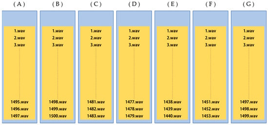 The above data are from the AI-Hub’s public data [21]. AI-Hub is an AI-integrated platform that anyone can utilize and participate in by supporting the AI infrastructure (AI data, AI SW API, computing resources) necessary for developing AI technology, products, and services. Among the existing public data, FER 2013 shows a large difference in the amount of data for each emotion, and the facial emotion data are acquired in low quality. The SFEW data were high-quality data but small in size, with approximately 2000 cases. In the case of CMU-MOSI, the speech domain was limited to movie reviews and the emotion classification was limited to positive and negative; thus, AI-Hub’s public data were compiled. The dataset was gathered from among 100 aspiring actors and acting experts, acquiring seven emotional classes: happy, surprised, neutral, fearful, disgusted, angry, and sad. A total of 10,351 videos and voices were included by performing speech and acting, 100 times per emotion. The speech files were configured as shown in Figure 18. Data samples are as shown in Figure 19.