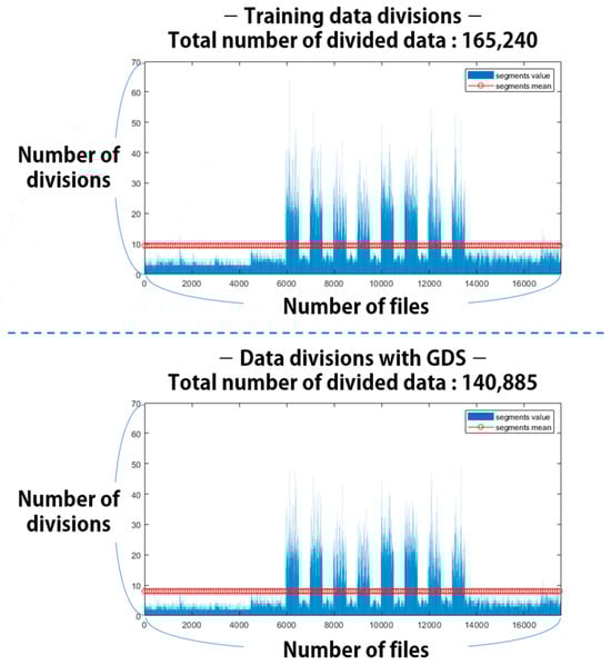 When speech is divided into time domains according to the model input size, unnecessary sections unrelated to the features to be classified and predicted are generated. To effectively select and exclude this section, GDS preprocessing using a Gaussian distribution and correlation coefficients was performed. Figure 20 shows the number of sequence segmentations for each file in the training data before applying the GDS and the number of sequence segmentations for each file in the training data after the application. The data before application are divided, consisting of 165,240 data points. After the application, unnecessary sections are reduced to 140,885, a total of 24,385 data points are excluded, and the data are reduced by 15%. These results confirm that the learning time and the time consumed computing resources can be saved.