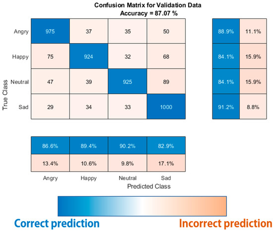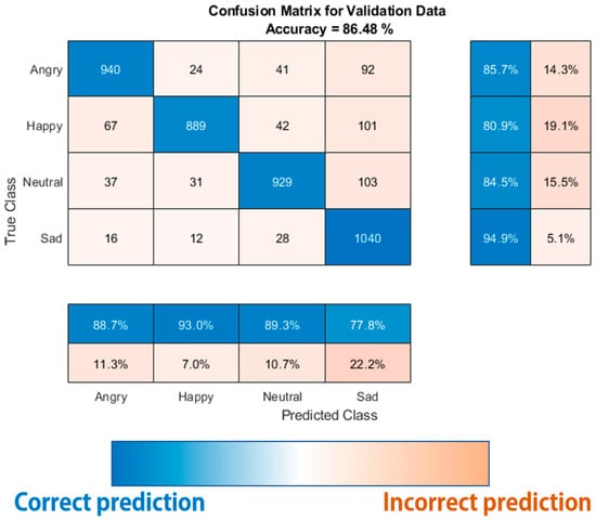 Classification was performed on the sequence segmentation sections using the above model. The accuracy values of the sections corresponding to the original data were synthesized, and the average value was used to define the class. Learning and validation data were conducted by mixing data from the entire dataset and dividing it into 85:15 ratios. Figure 21 shows the accuracy of the developed fusion model, demonstrating high accuracy in classifying the four core emotions. As shown in Figure 22, the GDS is applied to remove data that do not affect learning. Its accuracy was analyzed using test data in which the same data selection was applied. The total number of data points was not affected, and as the number of sequence segmentation sections corresponding to each data point decreased by 15%, the learning time decreased, while the accuracy remained similar.