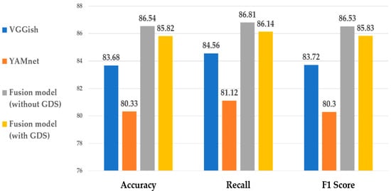 Figure 23 compares the performances before and after applying the GDS to the designed fusion model and existing transfer learning models, VGGish and YAMNet, in terms of accuracy, recall, and F1 score. Recall is an evaluation indicator representing the ratio of what the model predicts as positive to actual positives. The F1 score is the harmonic average of the model precision and recall and is an indicator of the evaluation by considering the two. YAMNet shows the lowest performance, and VGGish outperforms YAMNet. The designed model shows improved performance in terms of all evaluation indicators compared to the existing transfer learning model. There is only a small difference before and after applying the GDS.