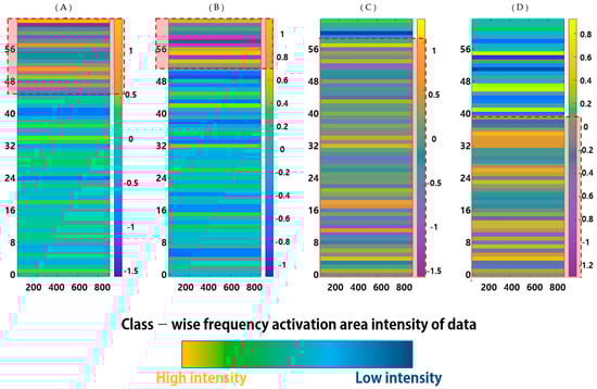 Grad CAM creates a focus area that uses the gradient of the classification class, which uses a backpropagation gradient to describe the class classification of a model [19]. An input image is passed through a CNN to generate a feature vector, and the class is classified using this feature vector. As the score of the classified class, the gradient collected for each channel in the previous layer is used as a weight to determine how much each channel influences the class score. The spatial area related to the class is obtained from the feature map, restored to the original size, and expressed visually. As can be seen in Figure 10, Grad CAM uses a spectrogram that is converted to examine the changes in both the time and frequency domains. Subsequently, the spectrogram passes through a CNN, and the results demonstrate which time and frequency section are essential for the classification class by restoring them to the size of the original.
