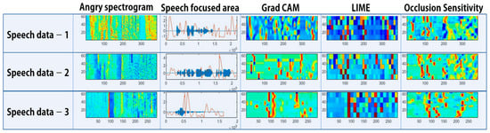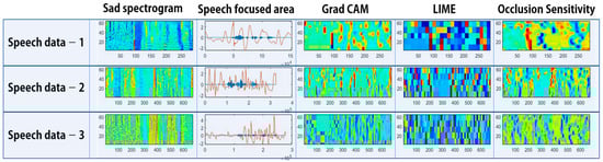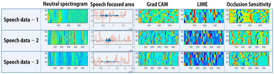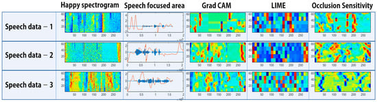 Figure 26, Figure 27, Figure 28 and Figure 29 show images that verify the model’s decision-making process by applying Grad CAM, LIME, and occlusion sensitivity to the speech spectrograms. In images in which the explainable technique is applied, areas of the input spectrogram that influence the model’s decision-making can be identified. Grad CAM uses gradient information through class scores in the model. Therefore, it has a high level of interpretation regarding which areas are important. In the case of LIME and occlusion sensitivity, by checking the extent to which a certain area influences the model classification, the areas that affect classification differently from Grad CAM can be determined.