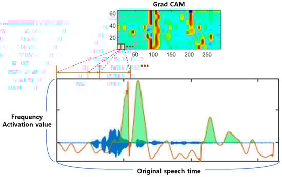 Figure 30 shows that the influence of the frequency, obtained from Grad CAM, is added to the time domain to examine time features rather than frequency features in the input image. Many frequency areas are considered to be concentrated in specific periods, indicating that words or intonation during these times play an important role in classification. When the parameters used for spectrogram conversion are reversed to restore the size of the original speech signal, it becomes difficult to perceive it audibly due to noise. Therefore, convolution with a filter value of one is applied to a rapidly vibrating part and postprocessed to stabilize it, ensuring it sounds natural when heard. Speech from areas with positive activation values are then extracted to determine which words, phrases, and intonations influence the classification decision.