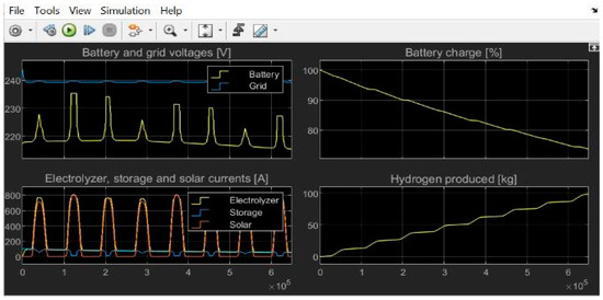 The system’s impressive ability in producing hydrogen by electrolysis is shown in the Simulink chart result for Hydrogen Production in kilos, where the highest score was 98 (Figure 5). This peak value suggests that the energy resources were used efficiently, most likely when solar power input was at its best and the grid was stable. The system’s ability to capture renewable energy sources and transform them into a clean, sustainable energy source is demonstrated by the significant hydrogen generation. As the Simulink chart illustrates, reaching a high level of hydrogen production means that solar power and electrolysis processes have been successfully integrated, which is in line with the system’s goals of encouraging green hydrogen generation. This result highlights the system’s potential as a dependable and environmentally beneficial part of the larger energy landscape and supports its ability to considerably contribute to the creation of a clean energy source.