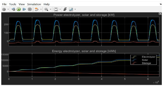 The energy performance of the system is shown dynamically by the Simulink chart results for Energy in kilowatt-hours (kWh) for the Electrolyzer, Solar, and Storage (Figure 6). From 0 to 14,000 kWh, the electrolyzer’s energy output increases gradually, suggesting a steady and significant production of hydrogen over time. Notably, the Solar Energy exhibits a coordinated performance pattern with the Electrolyzer, ranging from 0 to 12,000 kWh. The concurrent rise in Electrolyzer and Solar performance scores points to a balanced reaction to ideal solar power conditions, which increases the production of hydrogen. The Energy stored in the Storage component, on the other hand, indicates that stored energy is primarily being used rather than accumulating, as it displays a downward trend from 0 kWh. This use is consistent with efficient energy management; it might even direct stored energy to adjust to changing grid conditions or demand variations. Thus, the Simulink diagram illustrates a flexible and integrated system in which the Solar and Electrolyzer components work together to promote the generation of hydrogen, while the Storage element dynamically controls energy storage and release in response to the system’s actual needs.