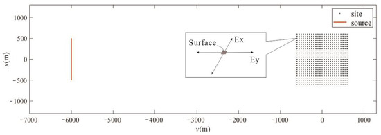 Figure 3. The center of the transmitting source is situated at 6000 m in the x-direction, with a length of 1000 m and a power supply current of 10 A, indicated by the red line in the figure. There are 25 survey lines, each spanning 1200 m and comprising 25 sites per line, spaced 50 m apart, totaling 625 sites, as denoted by the black dots in the figure. The simulated observations span 18 frequencies ranging from 8192 to 0.1 Hz (8192, 4096, 2048, 1280, 640, 320, 160, 80, 64, 32, 16, 8, 4, 2, 1, 0.5, 0.25, 0.1).
