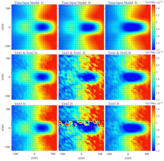 Figure 5 presents the synthetic data used for the time-lapse model and algorithm testing, with the black dots indicating the positions of the observation sites. Time-lapse Model 1t, Time-lapse Model 2t, and Time-lapse Model 3t represent the slices of the forward responses (Ex = 16 Hz) at three different time steps for the time-lapse model. Gaussian noise at levels of 2%, 8%, and 5% was added to the forward responses of the three time steps for the time-lapse model at 18 frequencies. Two different time-lapse inversions, Test 1 and Test 2, were conducted with different inversion parameters to discuss the time constraint effect of the time-lapse term. The noise level of Time-lapse Model 2t was increased to 50% for Test 3, addressing the anti-noise effect of the time-lapse inversion.