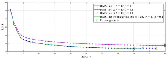 Figure 6 reveals that the incorporation of the time-lapse regularization factor β decelerates the rate of RMS reduction in data fitting. This phenomenon can be attributed to the diminished influence of the data term in the inversion process, a consequence of integrating the time-lapse term. In the synthetic data test, the deviation value α remains constant. However, in Test 3, certain measurement points are impacted by high noise, leading to a higher initial RMS value compared to Test 1, as depicted in Equation (11). Test 3 underscores the challenge of fitting high-noise data, resulting in a more gradual reduction in RMS.