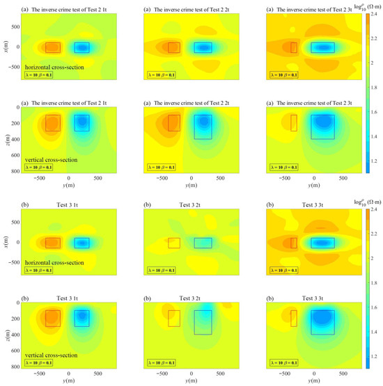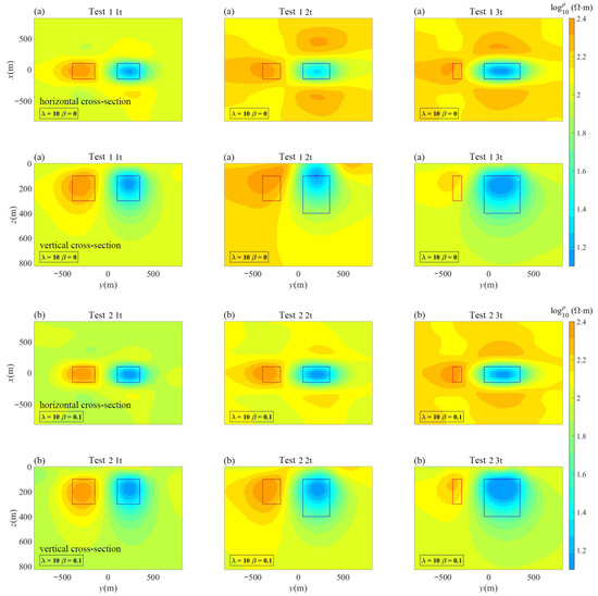 Figure 7a displays the inversion results of Test 1 with β = 0, where the time-lapse term does not impact the inversion results.