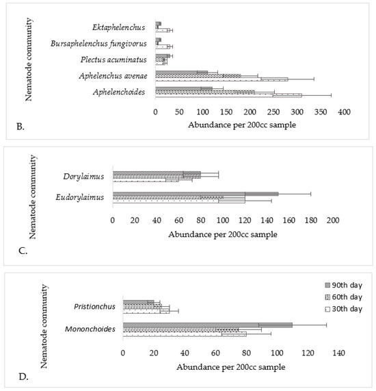 Abundance of the nematode community at the genera level per 200 cc compost sample: bacterivores (A), fungivores (B), omnivores (C) and predators (D) on the 30th, 60th and the 90th day of composting (n = 3).