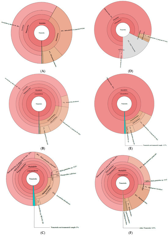 Krona graph representing the nematode community abundance estimated by NGS sequencing of pulled (n = 3) specimens in three compost variants without earthworms: C1 (A), C2 (B), C3 (C) and three compost variants with Eisenia fetida: C4 (D), C5 (E), and C6 (F) on the 30th day of composting.