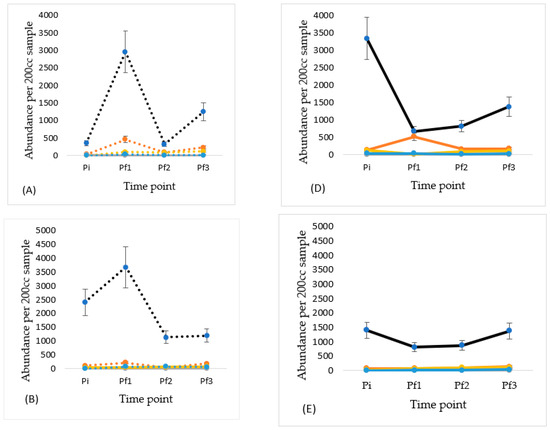 Panagrolaimidae can live in extreme conditions, including desiccation [43,44] freezing [45] and an unusual range of pH conditions [46]. Introduction into the compost E. fetida led to a noticeable reduction in H. gingivalis and H. cf. gingivalis, which also belongs to the Panagrolaimidae family (Figure 3). This species has been described as saprophytic bacteriovorous [47], which was detected in potting soil in Germany, in vegetable compost pile in the USA [48], in soil samples from the paddocks and meadows surrounding the stables and manure heap in Belgium [49] and in compost in Belgium [50]. It is referred to as a facultative parasite which infects horses [51,52,53,54], zebras (Equus grevyi) [55], humans [56,57] and some other species [52], causing granulomatous and neurological lesions. It has been detected worldwide but the majority of the reports in humans and equids so far come in Europe, North America and North East Asia [52]. Several routes of infection have been described, including the oral route via the ingestion of contaminated plant material [53], the respiratory route via inhalation of nematodes [52], and cutaneous infection [58]. Although H. gingivalis is a facultative parasite, infection from it is usually fatal. So far, treatment has been reported to be successful in only a few cases [47,58]. Moreover, it is tolerant to commonly use anthelmintic drugs, which does not allow us to expect better results of the therapy [49,50,51,52,53,54,55,56,57,58,59]. Halicephalobiosis, considered rare, can be a fatal disease that can result in mortality and morbidity in horses and humans, respectively. Our data align with those previously obtained [47,50], offering quantitative insights into the abundance and its alterations throughout the maturation of compost. Based on our experience, the incorporation of E. fetida leads to a decrease in H. gingivalis in all compost variants below 0.1% (Figure 4).