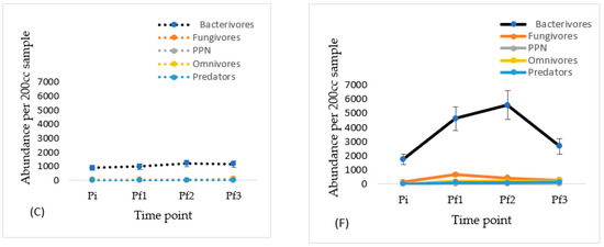 The nematode density per 200 cc compost sample at the level of five trophic group: bacterivores, fungivores, plant-parasitic nematodes (PPN), omnivores and predators in three compost variants without earthworms: C1 (A), C2 (B), C3 (C), and three compost variants with Eisenia fetida: C4 (D),C5 (E), C6 (F) during the fourth data collection period (Pi- on the initial day of composting, Pf1- on the 30th day of composting, Pf2- on the 60th day of composting, and Pf3- on the 90th day of composting) (n = 3).