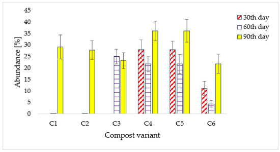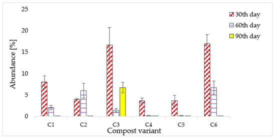 The presence of Eisenia fetida in the compost significantly increased the abundance of Diplogasteridae, with significant numbers observed as early as day 30 of composting. In variants without E. fetida, Diplodasteridae exceeded 0.1% only after 30 (C3) or 60 (C1, C2) days of composting. However, in composts inoculated with E. fetida, significant amounts (from 11.0% to 28.0%) were observed already on the 30th day.