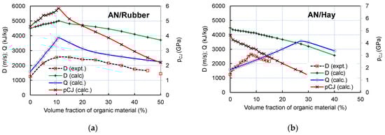 The changes in the experimental and calculated detonation velocities (D) and the calculated detonation heat (Q) and detonation pressure (pCJ) with the variation in the volume fraction of rubber and hay are shown in Figure 7.