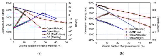 Change in calculated detonation velocity and oxygen balance (a) and detonation velocity and density with volume fraction of rubber and hay (b).