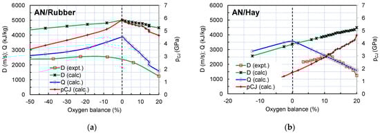 Variation in detonation parameters with oxygen balance with amounts of rubber (a) and hay (b).