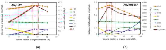 The main detonation products of the studied mixtures are H2O, N2, and CO2, while CO, CH4, NH3, H2, NO, etc., are present in smaller quantities. Since H2O and CO2 have the most negative values of the enthalpy of formation (−241.81 kJ/mol and −393.52 kJ/mol, respectively), these two detonation products contribute the most to the increase in Q. It can be also seen from Figure 10 that for both mixtures, the maximum detonation heat coincides with the maximum concentration of H2O and CO2. As shown in Figure 9, the maximum detonation heat was obtained for the AN/organic material ratio, corresponding to the zero oxygen balance.