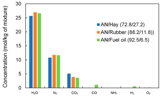 To understand the variation in the detonation properties of the studied AN-based mixtures with the amount of organic material, we analysed how the amount of organic material affects the composition and concentration of the detonation products. The concentration was calculated using the EXPLO5 code, and the results of the calculation are shown graphically in Figure 10.