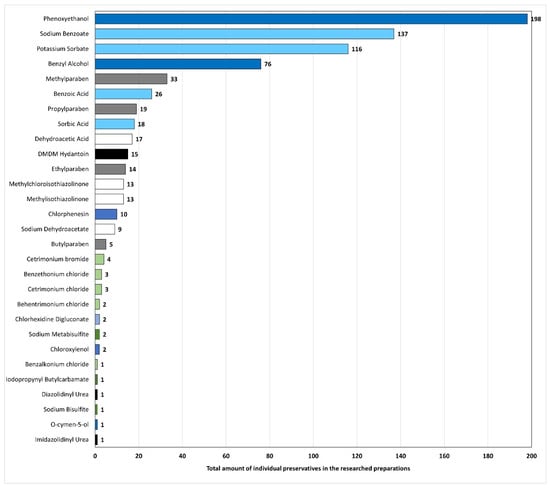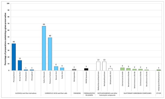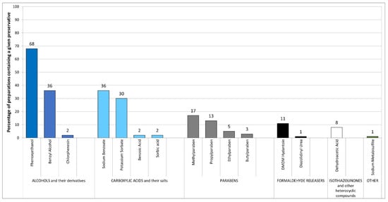A quantitative summary of preservatives according to product category is illustrated in Figure 5 and Table 1 and provides a general overview of the preservative content.