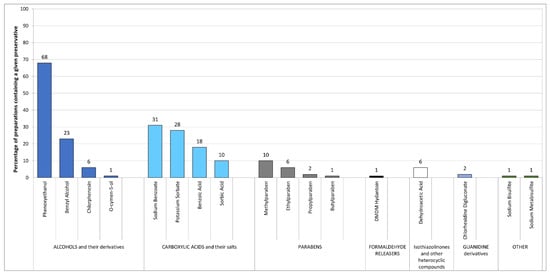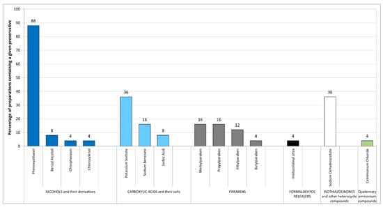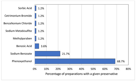The present survey also examined the numbers of combined uses of preservatives in a single product. Two-preservative preparations (34.8%) were most commonly used, followed by single-preservative products (25.5%) and three-preservative products (19.4%). Higher numbers of preservatives (from 4 to 8) per single product occurred less often, from 8.9% to 0.9%, respectively. Preservatives are combined to broaden the spectrum of their antimicrobial activity by synergistic effect. The use of combinations of benzyl alcohol with chlorobutanol and benzyl alcohol with methylparaben may enhance antifungal activity of the formulation compared to the single use of preservatives. The combination of methylparaben and propylparaben increases the antibacterial effect of the preservative system, but also affects the solubility, and enables the protection of both phases of the emulsions [31]. It is speculated that alcohols (benzyl alcohol and pentyl alcohol) exhibit synergistic effects with benzalkonium chloride [32].