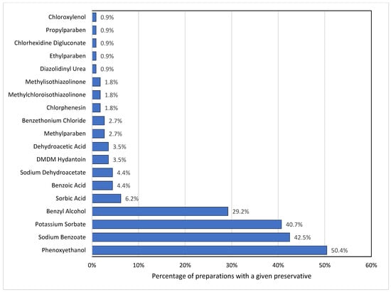 The most popular preservative in our research was phenoxyethanol. It exhibits a broad spectrum of antimicrobial activity, being effective against Gram-positive bacteria, e.g., Staphylococcus aureus, Gram-negative bacteria, e.g., Pseudomonas aeruginosa, and yeasts, such as Candida albicans and molds. It demonstrates a lower inhibitory effect on the bacteria of the skin microbiome than other preservatives, such as methylparaben and methylisothiazolinone. According to the SCCS (2016), when used as a preservative in cosmetic products at a maximum concentration of 1%, phenoxyethanol is safe for all consumers, including children of all ages [20]. The ECHA (European Chemicals Agency) does not classify phenoxyethanol as a sensitizer and regards it as the best-tolerated preservative used in cosmetics [21]. Phenoxyethanol also does not appear to be particularly allergenic: one study found the frequency of allergy to 1% phenoxyethanol to be only 0.24% in patch tests on a group of 6932 patients [22].