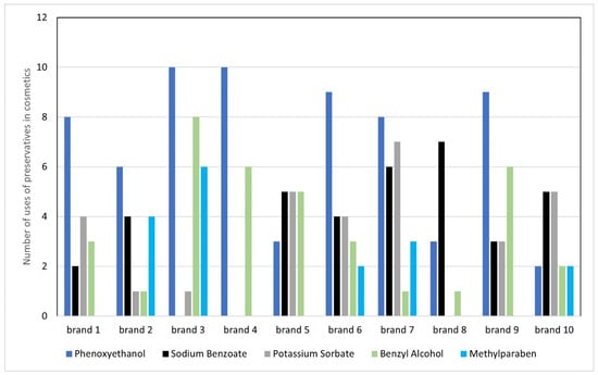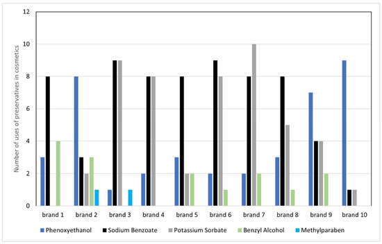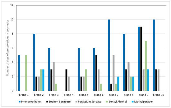Finally, the frequencies of the five most common preservatives in the investigated cosmetics, viz. phenoxyethanol, sodium benzoate, potassium sorbate, benzyl alcohol, and methylparaben, were analyzed according to individual cosmetic brand and product category. In each category, a hundred cosmetics from ten different brands were analyzed. As shown in Figure 8, Figure 9 and Figure 10, cosmetics manufacturers selected various preservatives from among these five. Most brands used five or four of these preservatives in their products; only some brands used only two or three.