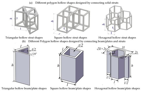 Figure 1a shows struts being used as the basic building blocks for polygonal hollow structures, whereas Figure 1b displays beams or plates as the alternative basic building blocks. Given that such polygon hollow structures can be built with either one of the two types of basic building blocks, it is imperative to make an informed decision on the best choice using analytical models that describe their respective behaviour [17,18]. As a result, it is crucial to conduct a comparative examination of the behaviour of polygon hollow shapes built using the two building blocks in order to rank them with regard to their mechanical efficiency. Additionally, for lattice structures with the same dimensions, it is important to determine the difference in the amount of material used to design these structures based on the two types of building blocks [18]. Polygon hollow structures built with struts are predicted to use less material than the ones built with beams or plates [16,18]. This is due to the fact that the latter type of building blocks requires the use of more material as compared to adopting struts [17].