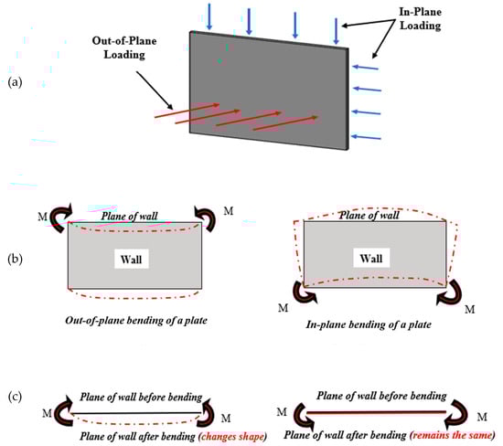 Shows (a) in-plane and out-of-plane loading of a plate and (b) out-of-plane bending on the left and in-plane bending on the right and (c) planes of walls before and after bending.