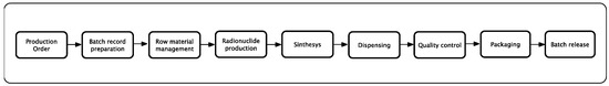 In general, the radiopharmaceutical manufacturing process starts with the production of the radionuclide and continues with the synthesis of the radiopharmaceutical according to the formulation described in the Marketing Authorization (MA) dossier or Pharmacopoeia Monograph [14].