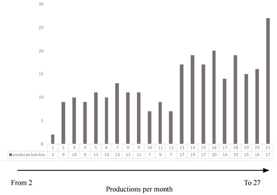 The first analysis concerns the productivity of the site evaluated through the number of productions/months. Figure 3 shows that over those 21 months, the productivity went from 2 productions per month to 27 productions per month.